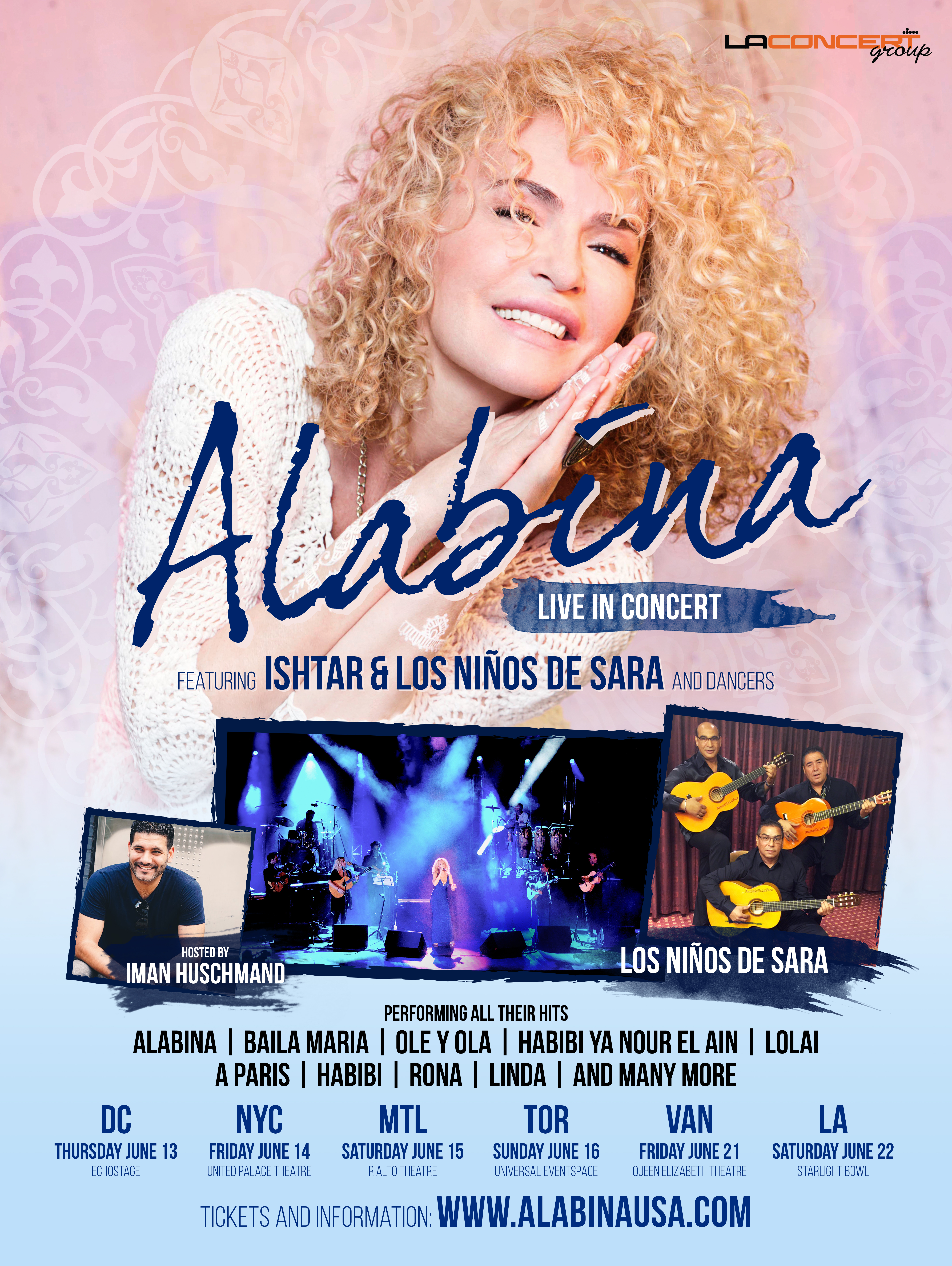 Their 2019 USA/Canada Tour, produced by LA Concert Group, is more than just a concert series, however. It’s a celebration; a celebration of more than twenty years performing together. Listeners new and old will be delighted to hear the band’s signature mixture of Flamenco and Middle Eastern performed with the kind of energy and mastery only musicians with two decades of experience can deliver. With a variety of iconic hits like “Alabina”, “Ole y Ola”, and “Lolai” in their arsenal, Ishtar Alabina are ready to bring the dance party to North America.